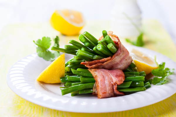 Пикантная летняя закуска: зеленая стручковая фасоль, запеченная с беконом в пряном соусе.