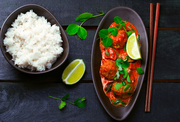 4. Подавать соус с жареными рыбными шариками, рисом и нарезанной зеленью.