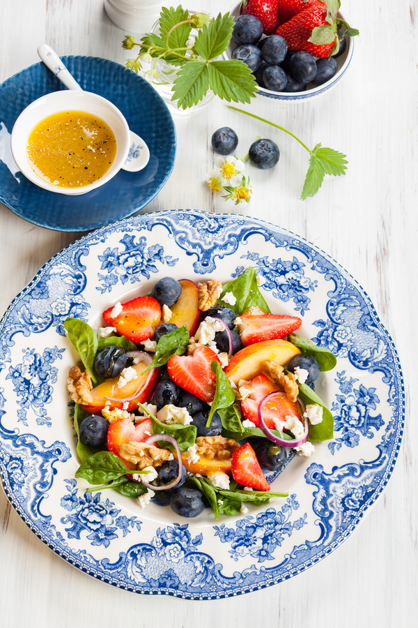 Рецепт оригинального летнего салата из зелени, персиков, клубники, голубики, грецких орехов и сыра. Это блюдо понравится даже самым придирчивым гурманам.