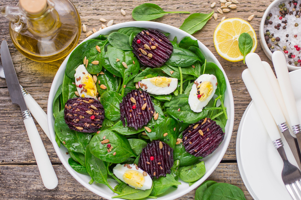 4. Застелить тарелку промытым шпинатом, сверху разложить яйца и запеченную свеклу. Посыпать поджаренными орехами или семечками.
