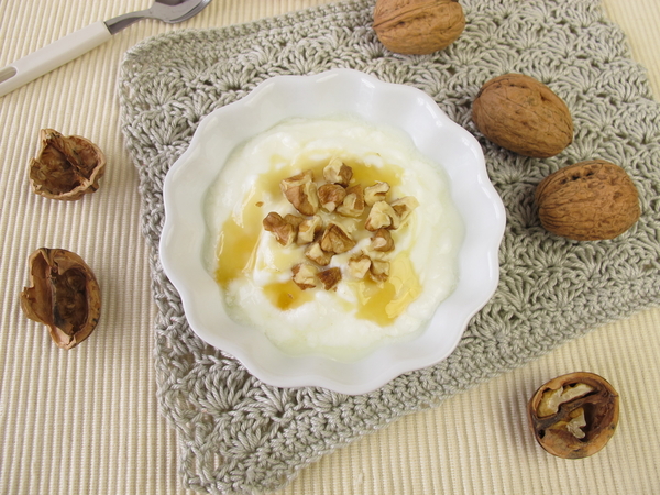 Вкусный и здоровый завтрак: йогурт с поджаренными орехами, корицей и медом.