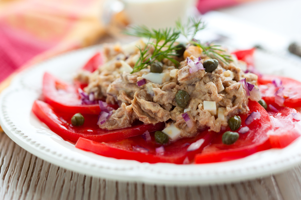 5. Смешать тунца, лук, яйца и каперсы. Посолить и поперчить по вкусу, заправить майонезом.