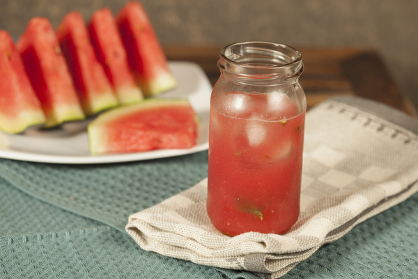 5. Наполнить стакан льдом и влить коктейль. Украсить сангрию кусочком арбуза. Подавать напиток к столу вместе с трубочкой.
