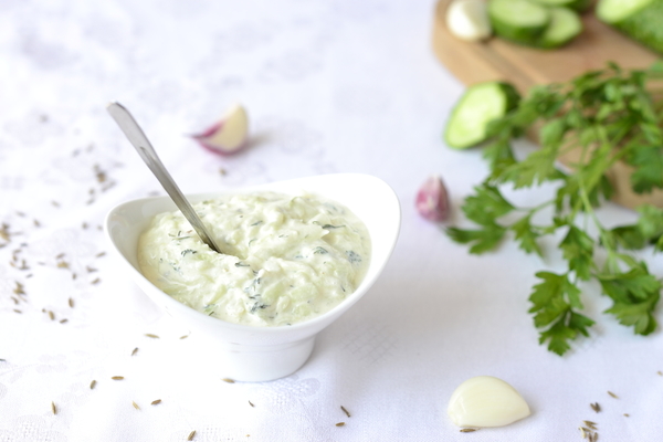 Холодный соус из йогурта хорошо подходит к рыбным и овощным блюдам. Его можно использовать как заправку для салата.