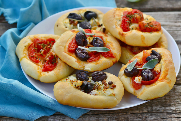 4. Выложить начинку: маслины, кусочки сыра и помидоров. Посолить, поперчить и добавить сухие итальянские травы. Запекать пиццы 15-20 минут при температуре 200 градусов.