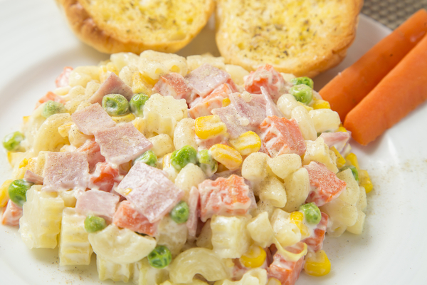 3. Смешать макароны, мясо, морковь, консервированную кукурузу и горошек. Посолить и поперчить по вкусу, заправить майонезом или сметаной.