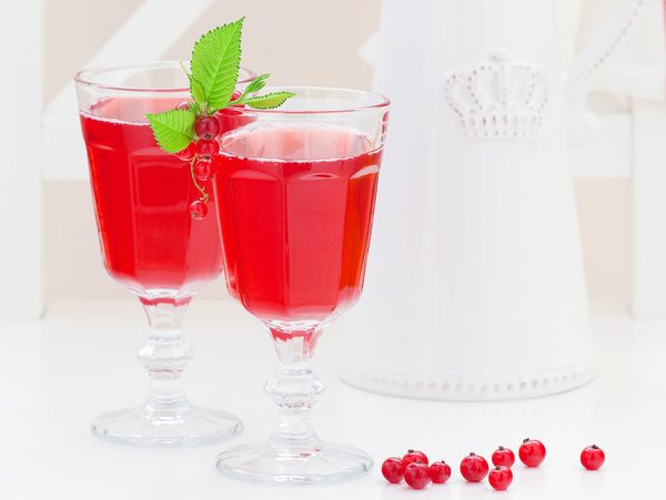 2. Встряхнуть и перелить в охлажденные* бокалы. Украсить веточками смородины и подавать.
