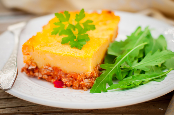 7. На дно формы выложить фарш, сверху разложить картофельно-тыквенное пюре. Посыпать остатками сыра.