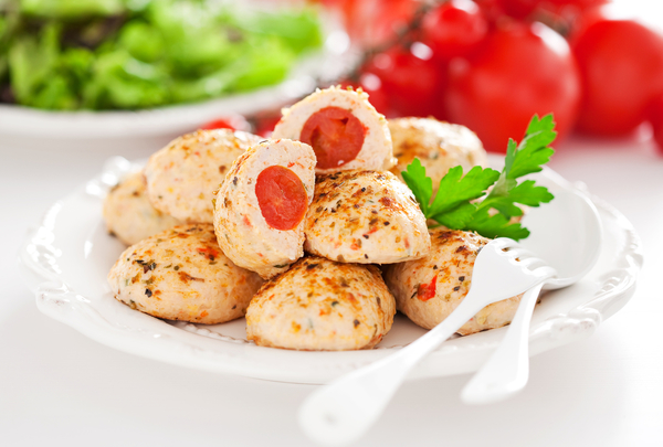 Диетические котлеты из куриного фарша и овощей очень вкусны и полезны. Внутри каждой можно найти маленький сюрприз – помидор черри.