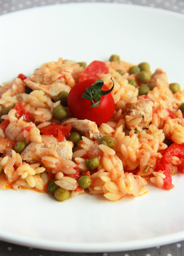 Паста орзо своим внешним видом напоминает рис. Сегодня мы приготовим орзо с филе курицы, горошком и помидорами.
