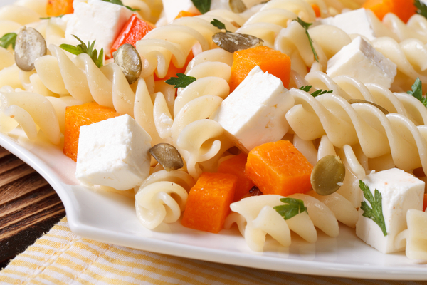 4. Пасту отварить, откинуть на дуршлаг. Вновь поместить пасту в кастрюлю, смешать с тыквой. Охлажденное масло с моццареллой нарезать ломтиками, смешать с пастой.
