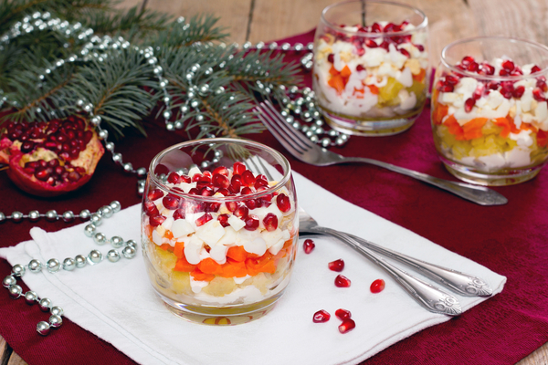 3. Выложить салат слоями в креманки, смазывая майонезом: слой картофеля, огурцов, моркови, сельди и яиц.