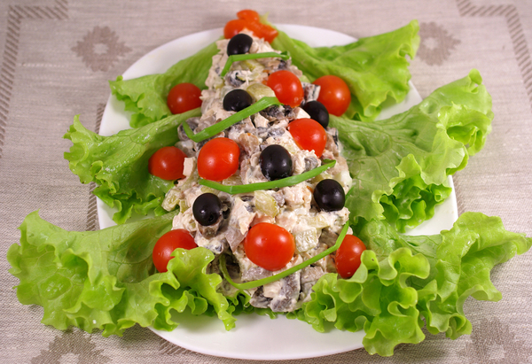 Вкусный салат на Новый год из отварного куриного филе, жареных шампиньонов, картофеля и маринованных огурцов.