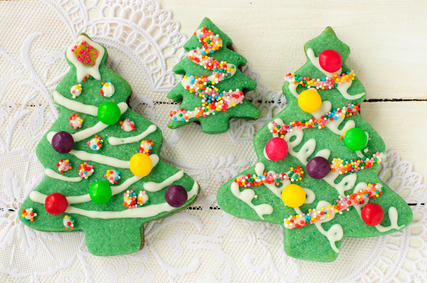 6. Украсить печенье с помощью кондитерского мешка или полиэтиленового пакета с отрезанным уголком. Глазурь застынет примерно через 20 минут. Елочки можно украсить кондитерской посыпкой или мелкими конфетками.