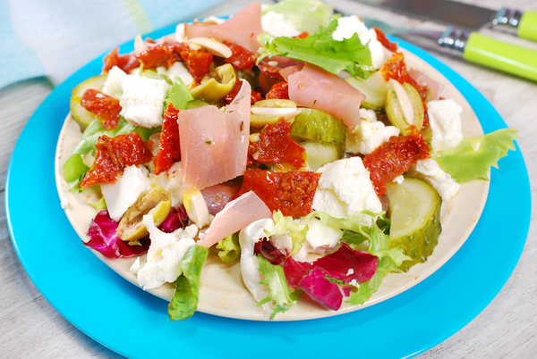 4. Выложить на тарелку салатные листья, помидоры, огурцы и маслины. Посыпать ветчиной и сыром, полить оливковым маслом и приправить по вкусу.