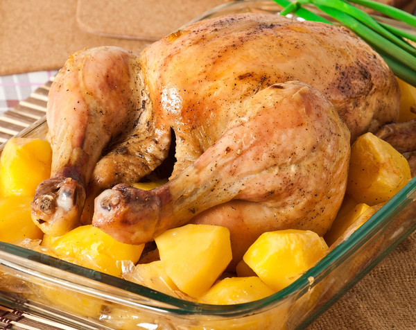 6. Затем курицу положить на противень, вокруг разложить оставшийся картофель и чеснок.