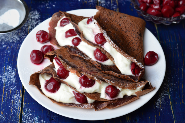 4. Смазать шоколадные блины рикоттой*, разложить сверху вишни и свернуть блины вчетверо. Посыпать сахарной пудрой перед подачей.