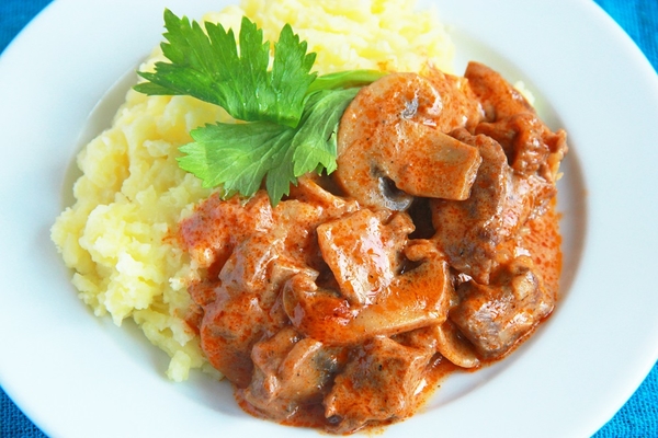 Готовим бефстроганов из говядины с шампиньонами и томатно-сметанным соусом.