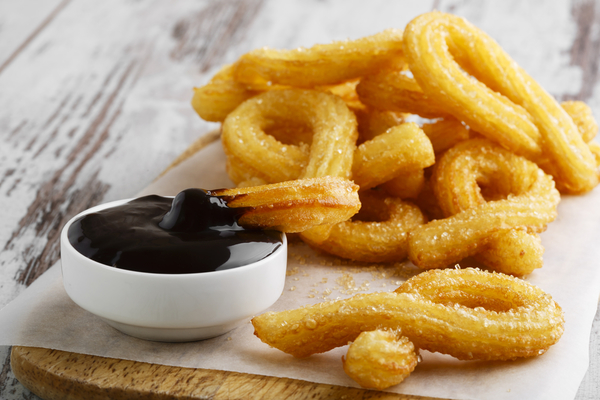 Это традиционный испанский десерт из заварного теста, жареного во фритюре. Чуррос подают на завтрак вместе с шоколадным соусом.