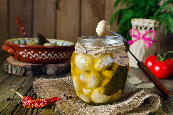 Быстрая закуска из грибов: маринованные шампиньоны в оливковом масле с чесноком и лавровым листом.