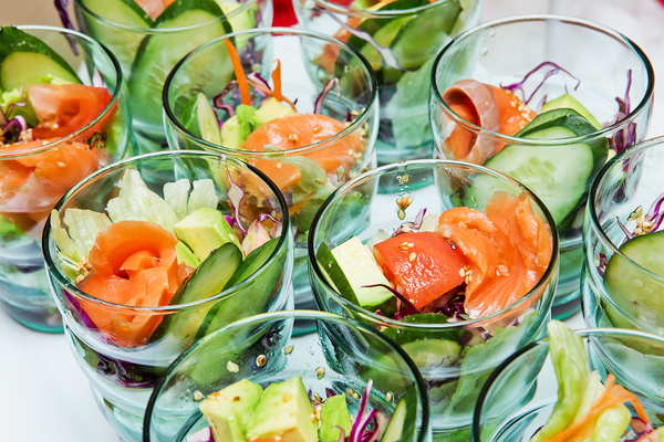 4. Выложить в порционные креманки салатные листья, огурцы, авокадо и рыбу. Полить смесью оливкового масла и соевого соуса, посыпать кунжутом.