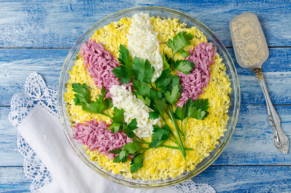 7. Посыпать салат тертым желтком. Сделать из стеблей петрушки, белых и окрашенных белков ветки сирени.