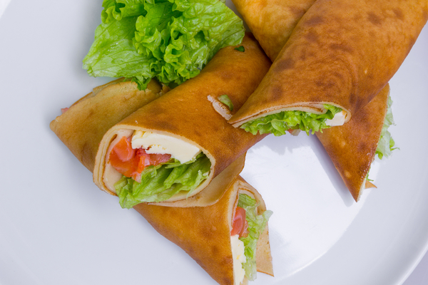 3. Выложить на блины начинку: листья салата, сливочный сыр и филе лосося. Сбрызнуть лимонным соком. Свернуть блины в рулеты.