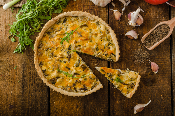 5. Наполнить основу картофелем, луком и чеддером. Взбить яйца, молоко и сливки, приправить. Вылить сверху на начинку.