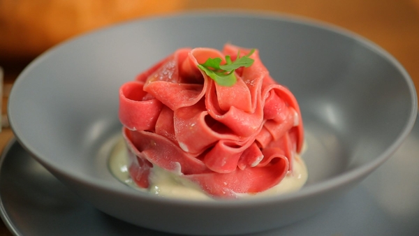 3. Высыпать всю муку на доску, сделать воронку. Влить смесь из свеклы и яиц. Осторожно, начиная изнутри, перемешать. Потом начать месить руками. Замесить тесто. Положить в пищевую пленку и отправить на 40 минут в холодильник.