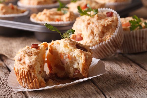 Несладкие кексы с ветчиной, сыром, помидорами и оливками удобно брать с собой на пикник.