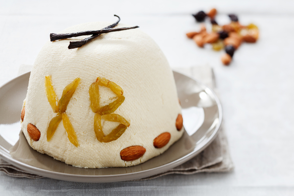 8. Отправить пасху в холодильник на сутки. Перевернуть на тарелку, снять марлю и украсить по вкусу.