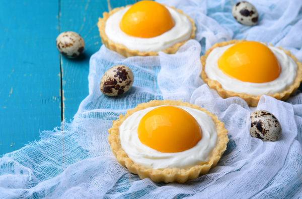 Корзинки из песочного теста с кремом и консервированными абрикосами своим видом напоминают яичницу. Это прекрасный тематический десерт к Пасхе.