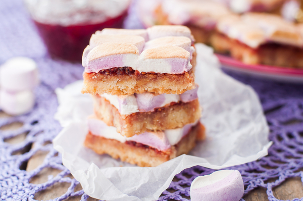 Простой десерт к чаю из песочного теста, малинового джема и жевательного зефира. Большие маршмэллоу нужно будет разрезать пополам.