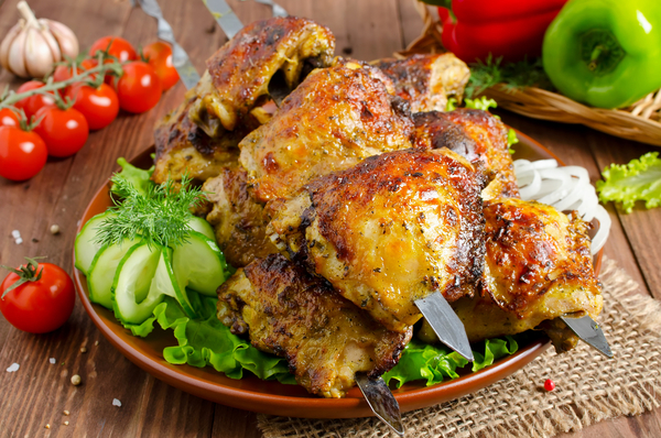 Из куриных бедрышек получается вкусный и сочный шашлык. Подавай его к столу вместе с овощами и томатным соусом.