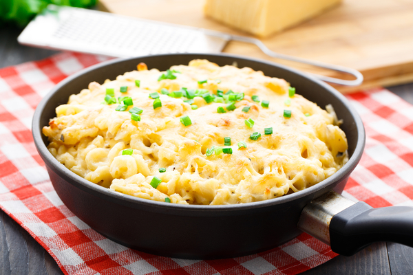 4. Слить макароны и добавить в сырную смесь. Приправить солью и перцем. Перемешать, посыпать зеленым луком и дополнительным количеством сыра.