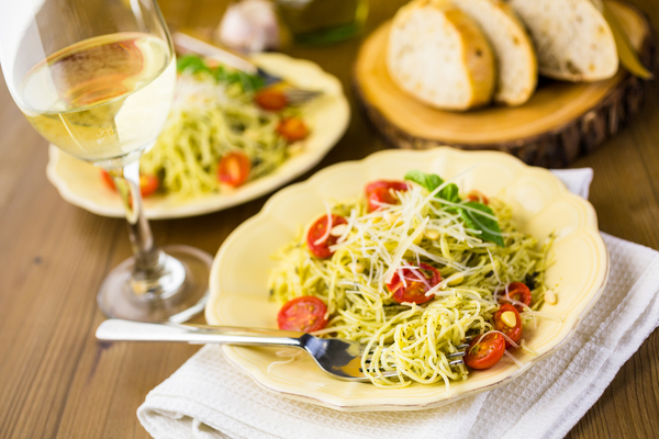 Аппетитная вегетарианская паста с соусом песто, помидорами черри, орехами и пармезаном. Соус песто можно купить готовый или приготовить домашний.