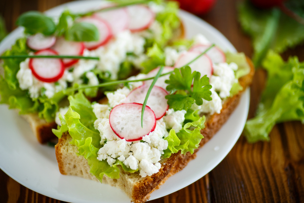 2. Разложить на зелени зернистый творог и кружочки редиса.