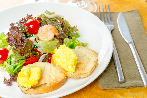 Праздничный салат из зелени, яиц, креветок, мяса криля, консервированных ананасов и помидоров черри с майонезной заправкой.