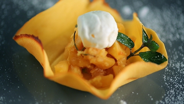6. В корзиночку выложите яблоки и мороженое. Украсьте листиком мяты.