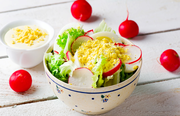 5. Смешать салатные листья, редис и мелко нарезанные яичные белки, заправить сметанным соусом.