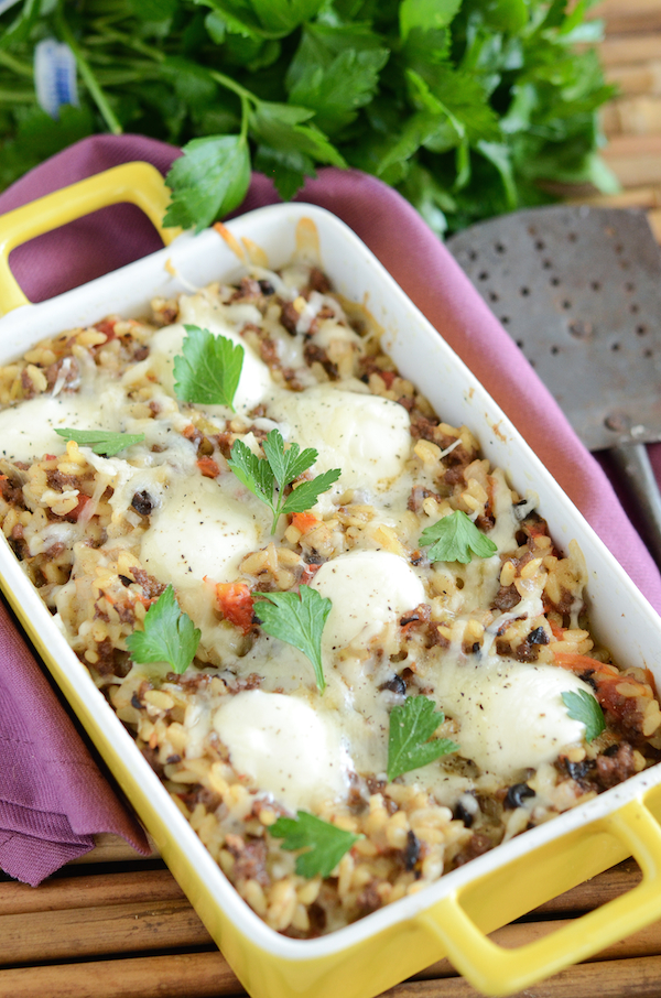 6. Выложить смесь в подготовленную форму. Запекать 25 минут. Посыпать остатками тертой моцареллы, проволоне и шариками моцареллы за 5 минут до готовности.