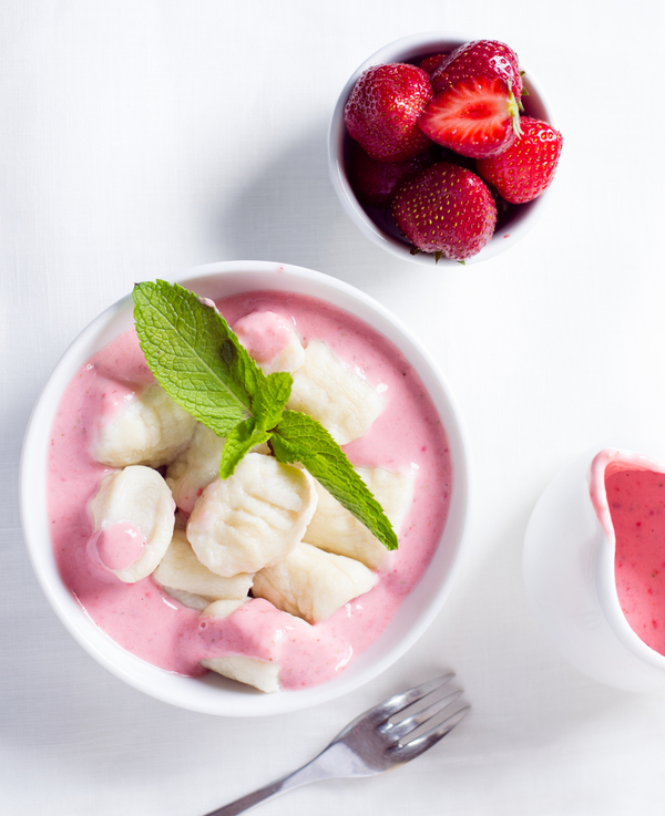 5. Подавать ленивые вареники вместе с клубничным соусом, украсив ягодами.