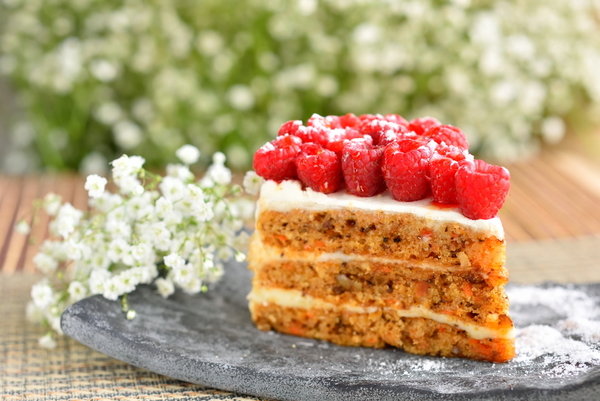5. Готовые коржи смазать кремом и собрать торт. Украсить его свежей малиной по желанию.