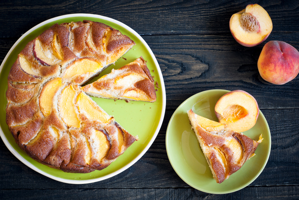 4. Выложить тесто на персики и выпекать в течение 30 минут. Накрыть фольгой, чтобы пирог не пригорел, и печь еще 45 минут. Готовность проверить зубочисткой.
