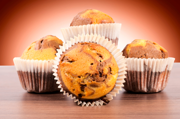 Мраморные кексы из бананового теста готовятся вместе с шоколадной пастой и орехами. Подавай их вместе с кофе или какао.