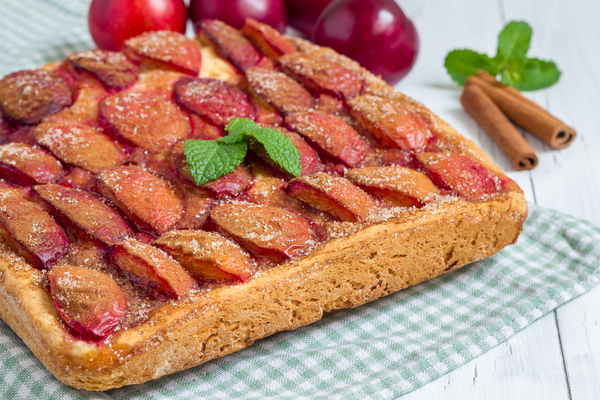 Для этого летнего пирога лучше всего подойдут сливы сорта Венгерка. В тесто можно добавить щепотку молотой корицы.