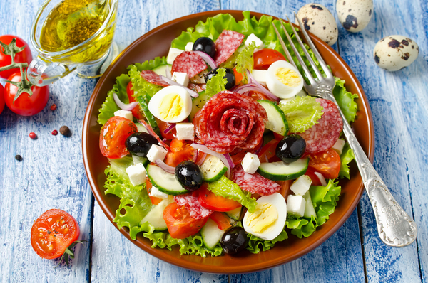 Красивый и вкусный салат из свежих овощей с фетой, маслинами, перепелиными яйцами и салями.