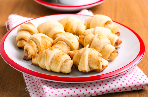 7. Готовые рогалики переложить на блюдо. По желанию их можно посыпать сахарной пудрой.