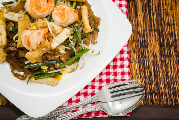5. Влить немного рыбного соуса, добавить имбирь, чеснок и грибы. Готовить около минуты. Добавить устричный соус и рисовую лапшу, обсохшую и смазанную маслом.