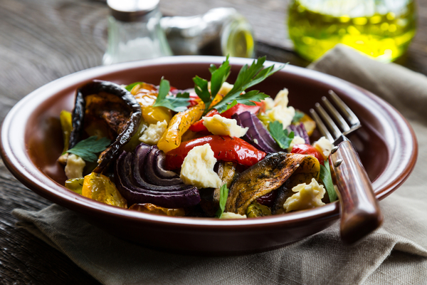 Вкусный салат из запеченных овощей с сыром и заправкой из оливкового масла можно подавать как гарнир к мясным блюдам.